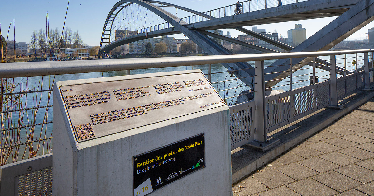 Reliées par la voie verte trinationale, Huningue, Weil am Rhein et Bâle le sont aussi par un sentier des poètes symbolisant leur langue commune : l’alémanique. Un sentier des poètes jalonné de 24 panneaux de part et d’autre du Rhin qui invitent à découvrir des poètes alsaciens, allemands et suisses.