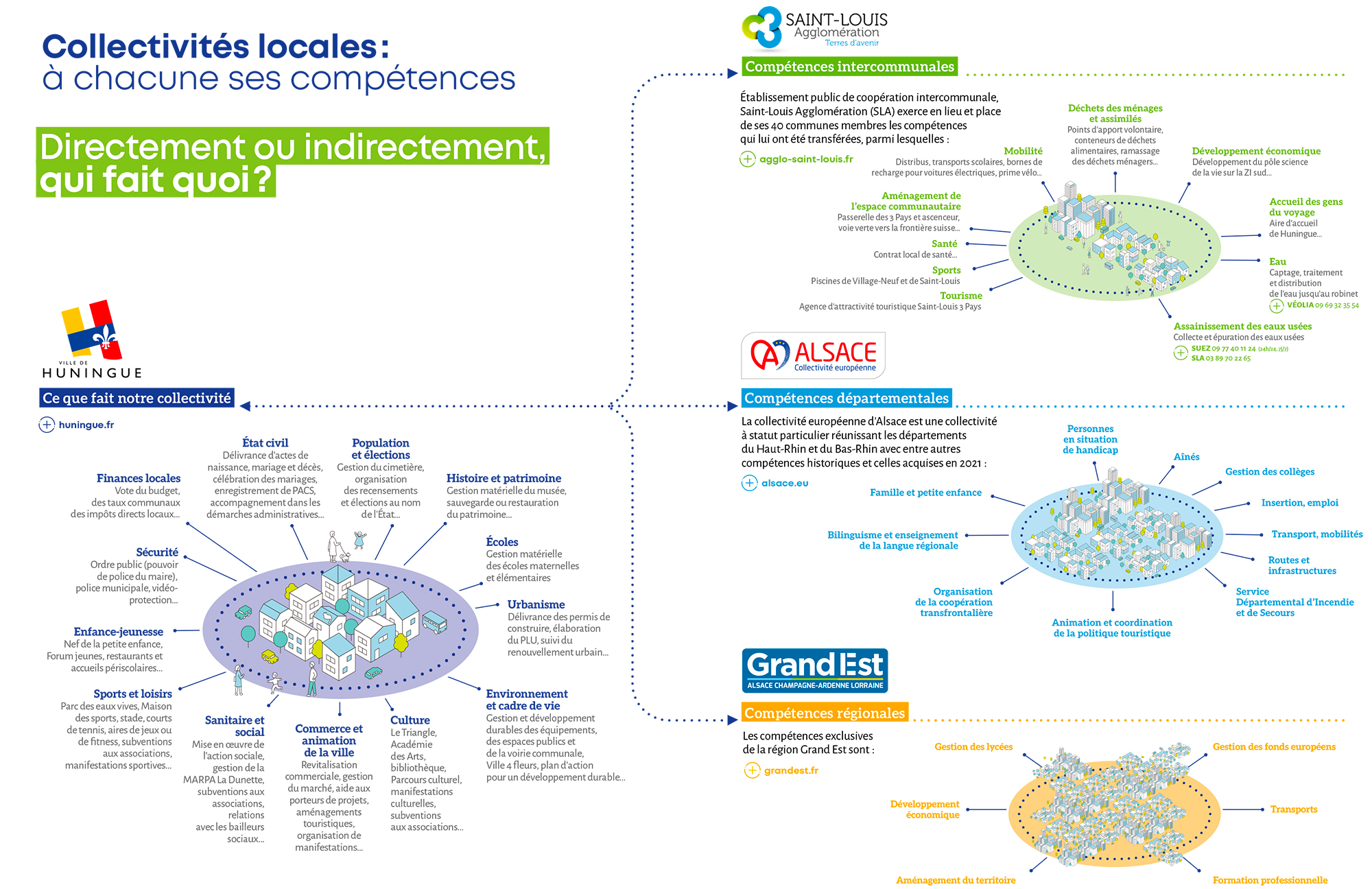 Comme chacune des communes françaises, Huningue exerce ses compétences dans les domaines définis par les lois de décentralisation et les réformes successives, en cohérence et en complémentarité avec celles relevant de l’intercommunalité et de la Collectivité européenne d’Alsace (CeA), ou encore de la région Grand Est.